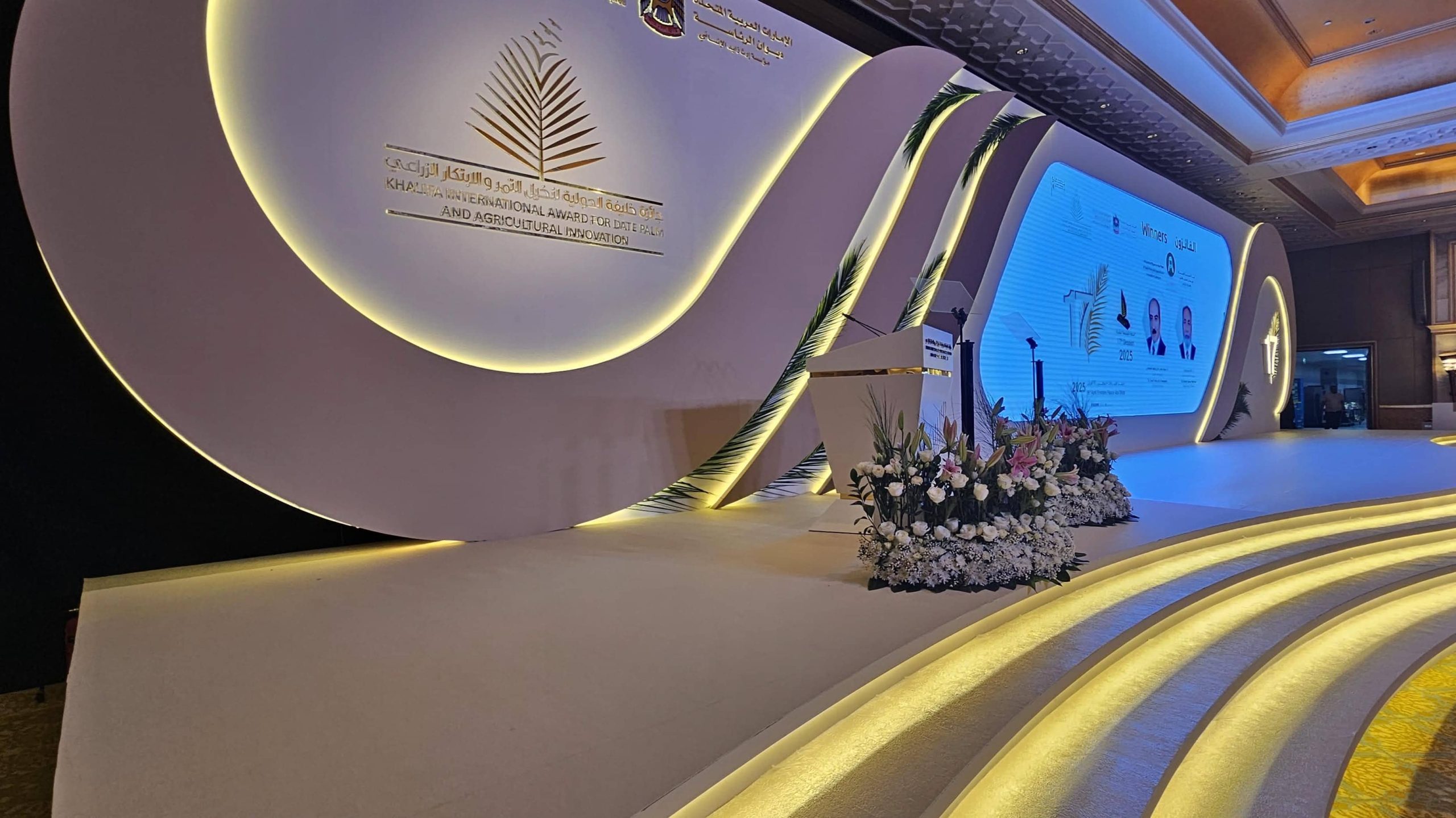 The design language presented in the images is calm, ceremonial, and highly structured. Large curved forms, warm integrated lighting, and palm-inspired visual accents reinforced the identity of the event, while the central screen created a clear focal point for presentations and award moments.